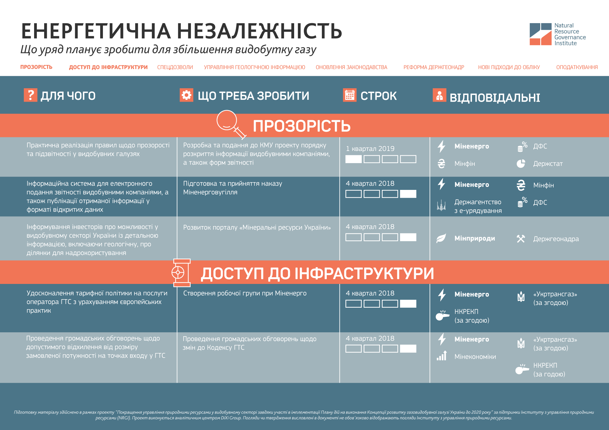 Аналітичний центр DiXi Group підготував інфографіку в якій детально розписано кроки Плану заходів, для чого вони мають бути зроблені, кінцевий термін реалізації та відповідальні. Матеріал підготовлено в рамках проекту «Покращення управління природними ресурсами у видобувному секторі завдяки участі в імплементації Плану дій на виконання Концепції розвитку газовидобувної галузі України до 2020 року» за підтримки Інституту з управління природними ресурсами (NRGI).