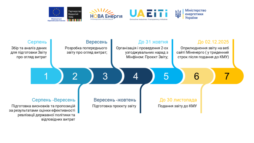 У серпні 2025 року стартував огляд витрат державного бюджету, який цього разу охоплює сферу видобувних галузей. Його проведення передбачене розпорядженням Кабінету Міністрів України від 15.04.2025 № 348-р «Про проведення у 2025 році оглядів витрат державного бюджету в окремих сферах» та наказом Мінфіну від 23.10.2019 № 446 «Про огляди витрат державного бюджету». Предметом аналізу стала бюджетна програма КПКВК 2401630 «Впровадження Програми реформування та розвитку енергетичного сектора», за рахунок якої фінансується підготовка щорічних звітів Ініціативи щодо забезпечення прозорості у видобувних галузях (ІПВГ). Саме ці звіти вже понад десять років є основним джерелом перевірених даних про платежі компаній і доходи держави.