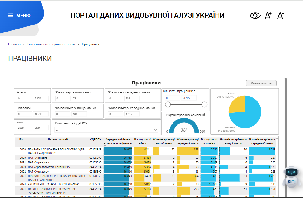 - Вимога 6.3 зобов’язує розкривати дані про чисельність працівників у видобувних галузях у розрізі статі, де такі дані доступні. Цією ж вимогою компанії заохочуються публікувати інформацію про гендерний розрив в оплаті праці. Саме це робить можливим базовий аналіз того, як розподілені робочі місця між жінками та чоловіками.