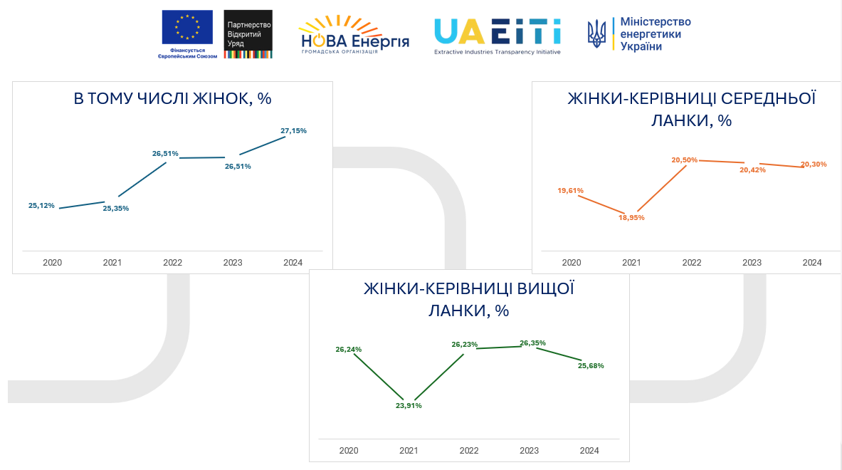 Дані, які компанії подають через Портал ІПВГ, показують одну дуже стійку тенденцію: в усі роки, з 2020 по 2024, частка жінок у видобувних галузях залишалася нижчою за 28%. У жодному звітному році цей показник не досягнув рекомендованих міжнародними стандартами 30%, які вважаються мінімальною ознакою гендерного балансу. Аналогічно стабільною залишається гендерна структура керівництва, де жінки складають лише від п’ятої до чверті управлінців.