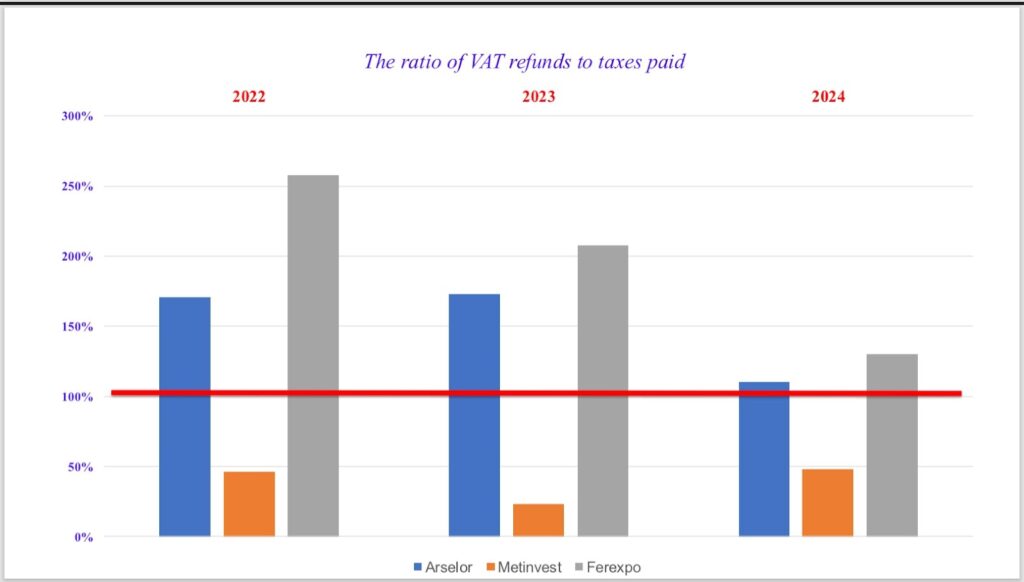 Поєднання всіх цих даних дозволило побачити узагальнену картину фінансових потоків між державою та основними промисловими групами залізорудного сектору — Arcelor, Ferrexpo та Metinvest Group. І саме ця картина виявилася несподіваною. Незважаючи на те, що всі вони демонструють значні обсяги податкових надходжень, у двох із трьох груп — Arcelor та Ferrexpo — співвідношення між сплаченими податками та отриманими бюджетними відшкодуваннями ПДВ виявилося від’ємним. Тобто сума державного відшкодування стабільно перевищувала суму податків сплачену компаніями групи до бюджетів усіх рівнів. Більше того, такий дисбаланс повторювався не одноразово: за даними 2022–2024 років дві групи послідовно перетинали поріг у 100% на графіку співвідношення, що може бути свідченням систематичного “вимивання” коштів з бюджету воочої країни на користь окремих власників компаній.