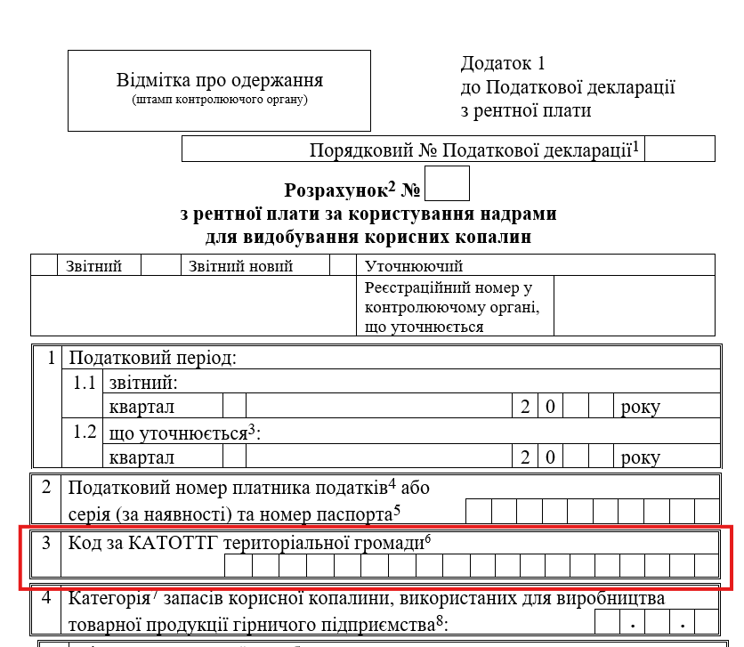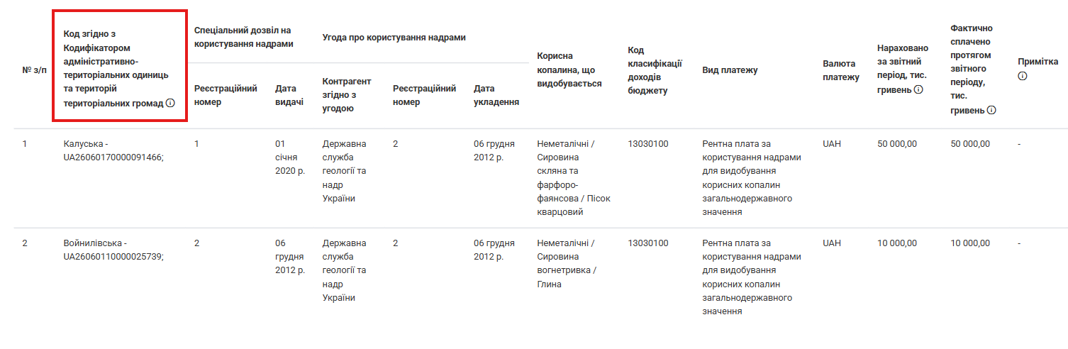 Для того щоб точніше ідентифікувати нарахування у Формі 5.3 Звіту про платежі на користь держави було запроваджено додаткове поле із зазначенням коду територіальної громади та коду населеного пункту, де здійснюється видобування.