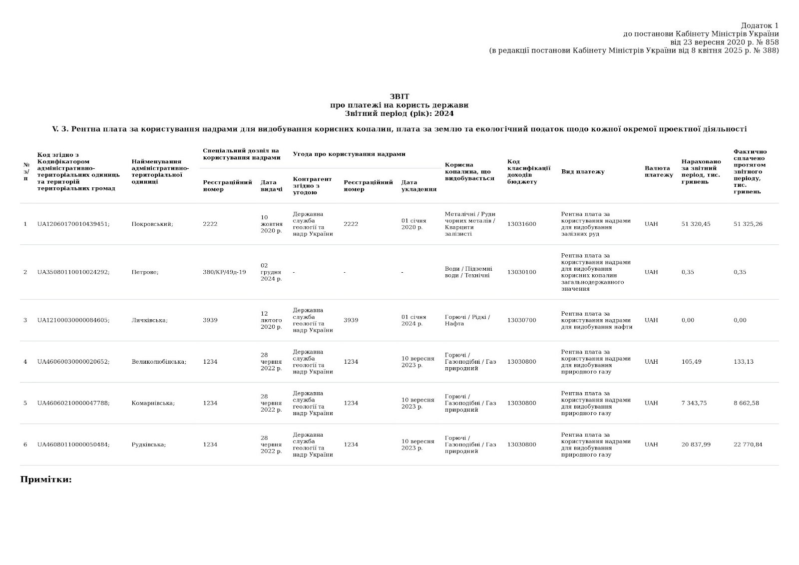 Компаніям рекомендується зазначати інформацію щодо платежів окремими рядками в розрізі кожної територіальної громади, на яку поширюється дія спеціального дозволу на користування надрами. Якщо дозвіл стосується кількох громад — дані мають відображатися по кожній громаді окремо.
